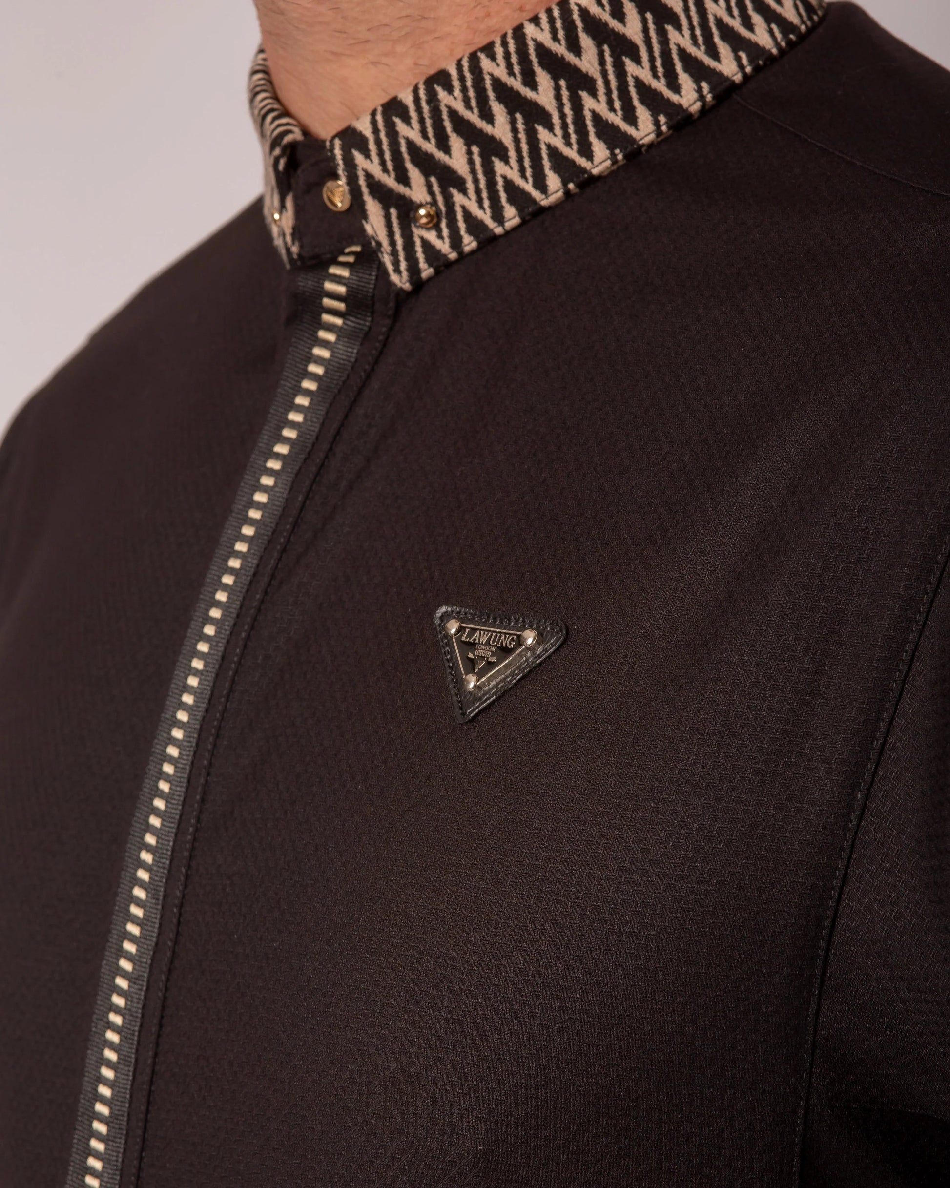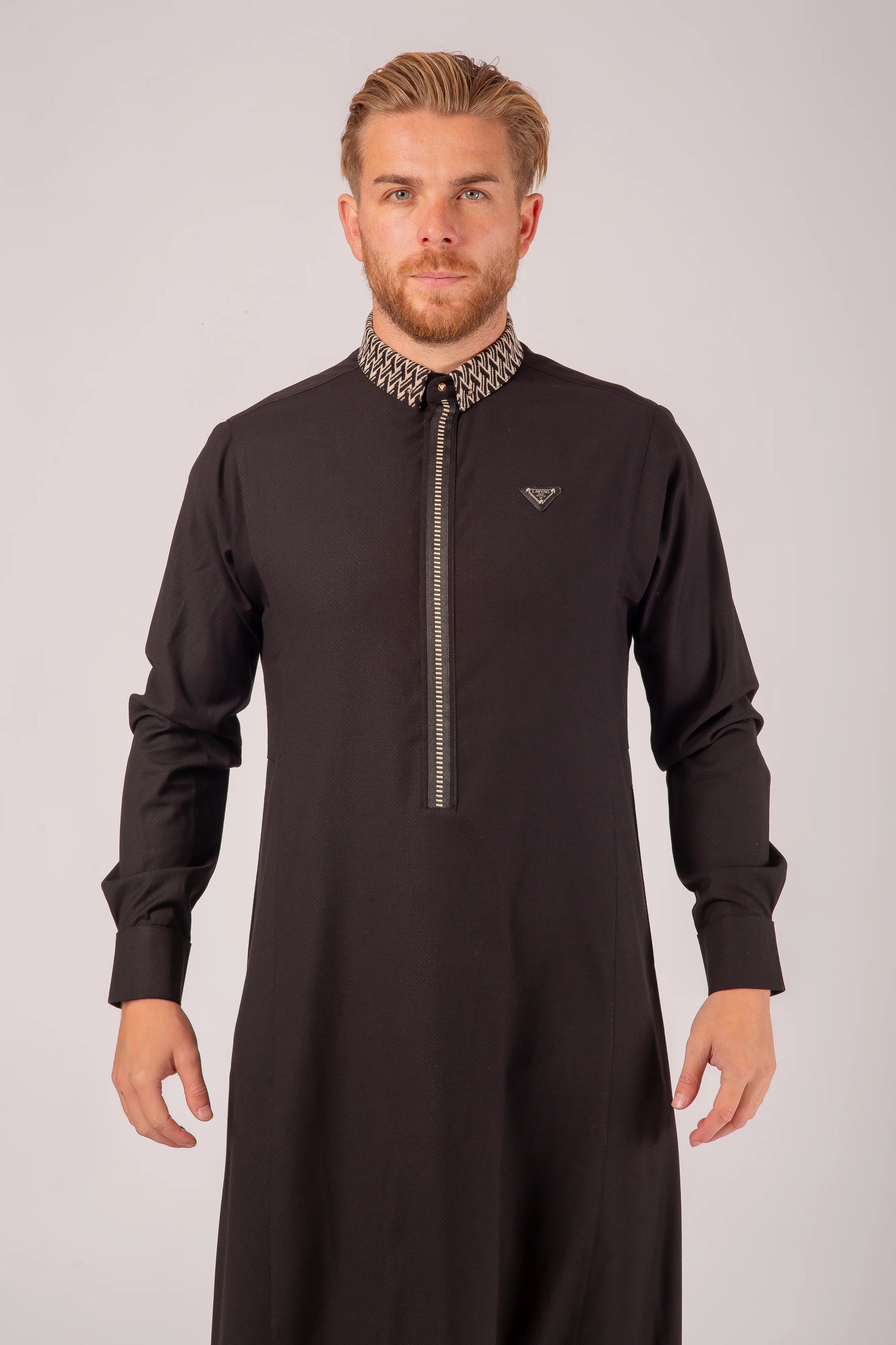 Tailored from premium black fabric, its sleek silhouette is elevated by a meticulously designed beige and black collar, adding a touch of regal charm. The perfect balance of comfort and grandeur, this thobe ensures a flawless fit while offering breathability and ease of movement. Whether you're attending a special gathering, Friday prayers, or an exclusive event, the Midnight Majesty Thobe makes a statement of class and distinction.