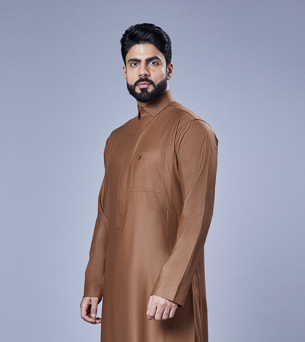Winter colored thobe for daily & formal use with shirt collar, concealed zipper placket & regular sleeves. Made with quality fabric 88% polyester & 12% viscose for long lasting comfort.