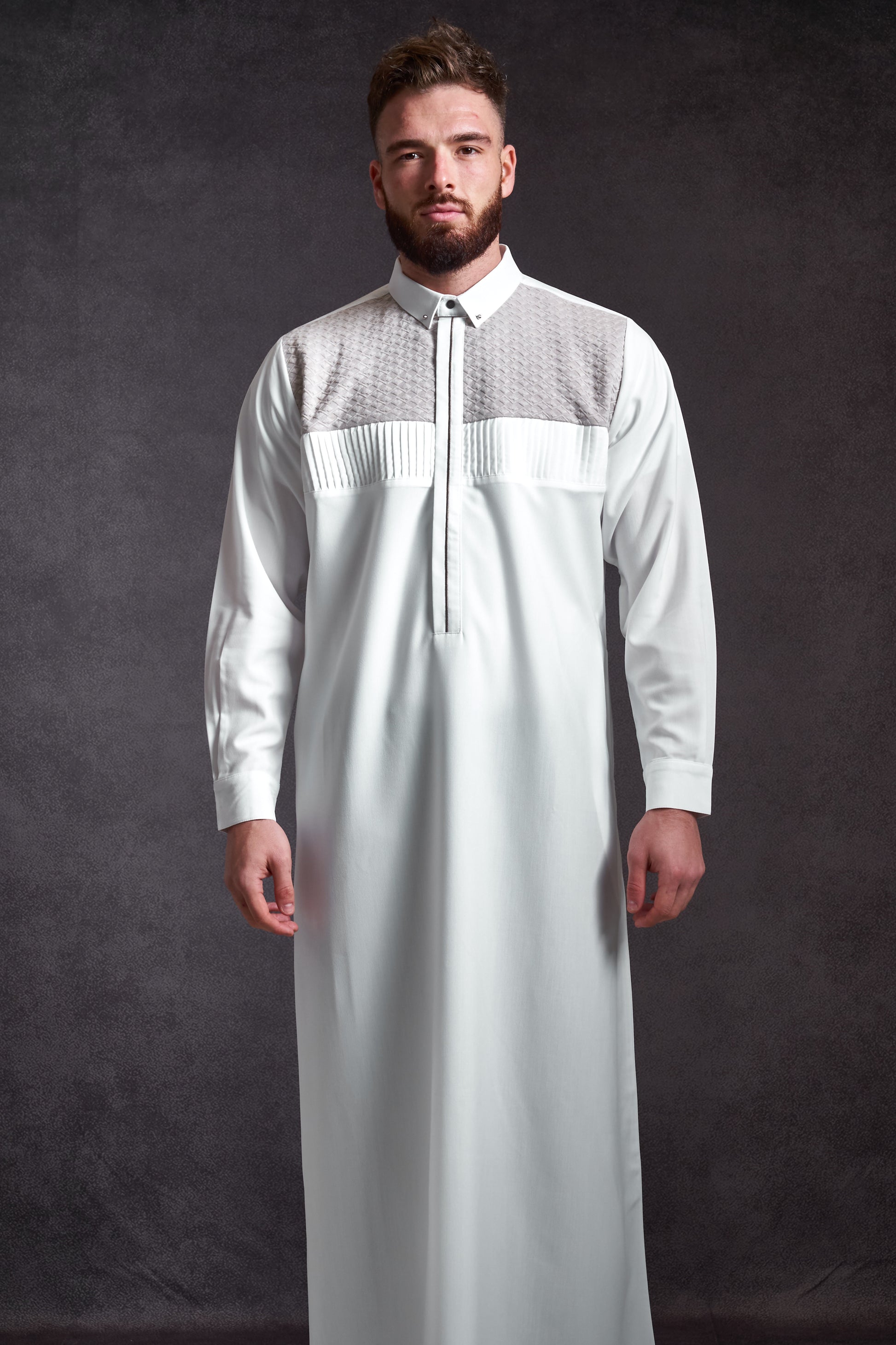 Ruffled White Thobe - Elegant Designer Muslim Wear from London